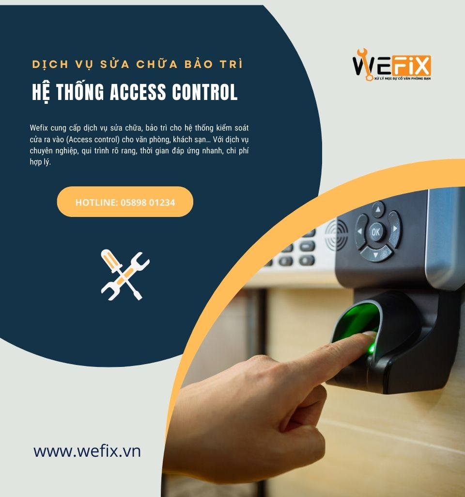 Wefix cung cấp dịch vụ sửa chữa, bảo trì cho hệ thống kiểm soát cửa ra vào (Access control) cho văn phòng, khách sạn, bãi xe… Với dịch vụ chuyên nghiệp, qui trình rõ ràng, thời gian đáp ứng nhanh, chi phí hợp lý.