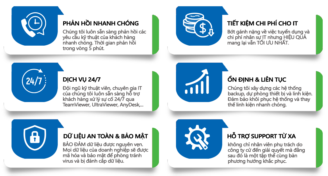 - Tập trung nguồn lực: tiết kiệm nguồn nhân lực & tối ưu chi phí thuê nhân sự nhờ vào cắt giảm nhân viên CNTT/IT cơ hữu tại doanh nghiệp. Hãy tập trung nguồn lực cốt lõi của mình vào việc quan trọng, CNTT/IT hãy để cho chúng tôi.